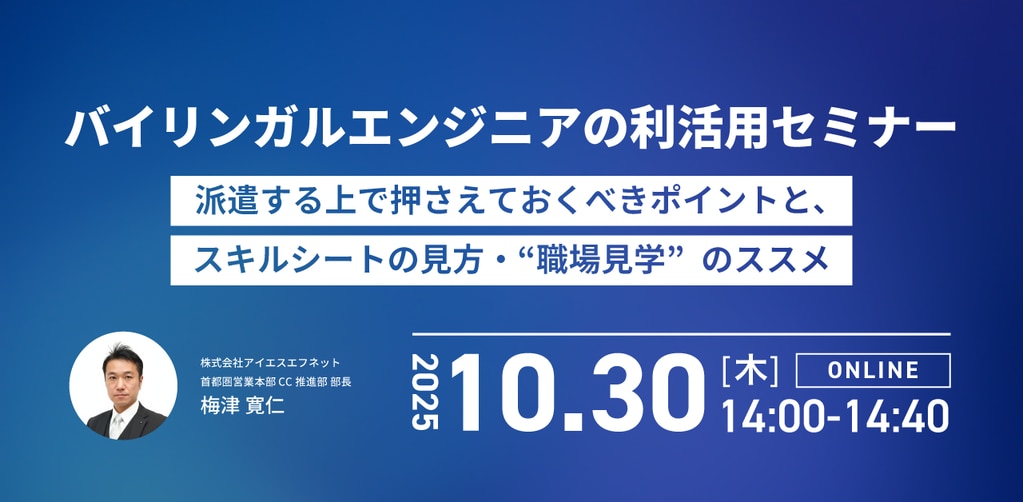 2025-10-30_バイリンガルエンジニアの利活用セミナー ~派遣する上で押さえておくべきポイントと、スキルシートの見方・“職場見学”のススメ~受付中お知らせ2025-10-15(更新:2025-10-29)