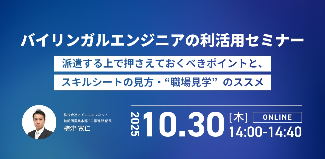| セミナー名 | バイリンガルエンジニアの利活用セミナー ~派遣する上で押さえておくべきポイントと、スキルシートの見方・“職場見学”のススメ~ |